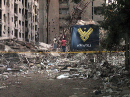 نشاهد بيت السيد حسن نصر الله وقد استهدفته الطائرات بعدة غارات حتى ساوت به الأرض (إنها فعل القنابل الذكية)، نشاهد قناة المنار وأعمدة الإرسال بارزة للعيان وسط ركام أكثر من 8 عمارات – أمامنا مدرسة المستقبل وقد سويت بالأرض – مؤسسة الشهيد مكونة من 10 طوابق لم تنجو من القصف. نستمر في تسلق الركام وتخنقنا رائحة الدخان الصادر من حرائق متعددة لا تزال تشتعل نتيجة للقصف الليلي. نتجه لشارع الشهيد راغب حرب وقد هدم على جانبيه 18 عمارة استهدفت مساءً والنيران لا زالت تلتهمها.. والدفاع المدني يجاهد في إطفاء الحرائق. ورغم تهديم مقر تلفزيون المنار – إلا أن الكاميرات كانت منصوبة في استقبالنا... حيث استقبلنا استقبالاً لا مثيل له.. بالود والقبل، عندما عرفوا بأننا قادمون من البحرين نحمل مشاعر الود والحب والتعاطف مع الشعب اللبناني ومقاومته الباسلة والى سيد المقاومة السيد حسن نصر الله. يفتخرون بما قامت به البحرين من مساندة ودعم أخوي ويقولون بأن له اثر كبير على معنويات الناس وخصوصاً المقاتلين على الجبهة. أجرت قناة المنار مقابلة مع الوفد وبثت بشكل مباشر.