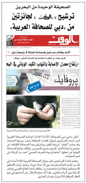 أعلن نادي دبي للصحافة، الأمانة العامة لجائزة الصحافة العربية أمس أسماء المرشحين لجوائز الفئات المختلفة ضمن دورتها السابعة، وقد جاءت ''الوقت'' مرشحة للفوز بجائزتين هما الصحافة الثقافية عن موضوع ''هدايا التابو'' للزميل حسين المحروس، وكذلك جائزة الصحافة البيئية عن تحقيق ''استخدام مياه الصرف الصحي'' لعدد من الزملاء في قسم المحليات.