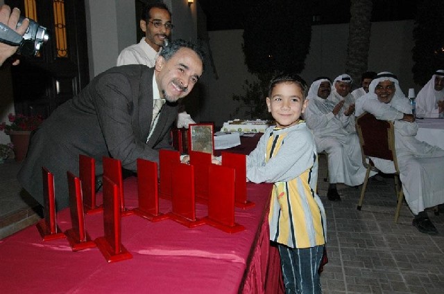 (الصورة: مجيد الزيرة يقدم درعاً لأصغر الممثلين عدنان عيسى)