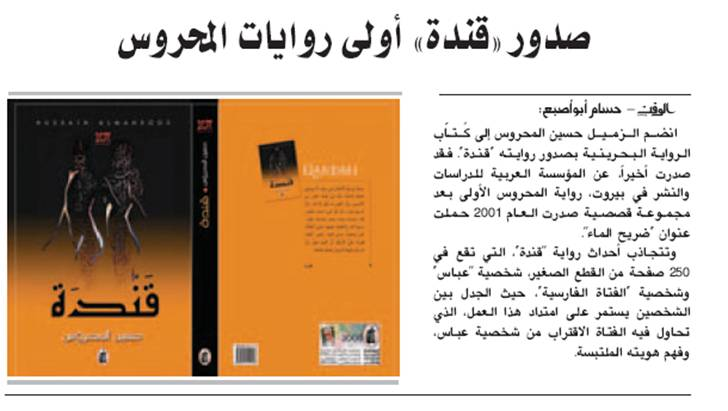 انضم الزميل حسين المحروس إلى كُتاّب الرواية البحرينية بصدور روايته ‘’قندة’’. فقد صدرت أخيراً، عن المؤسسة العربية للدراسات والنشر في بيروت، رواية المحروس الأولى بعد مجموعة قصصية صدرت العام 2001 حملت عنوان ‘’ضريح الماء’’.