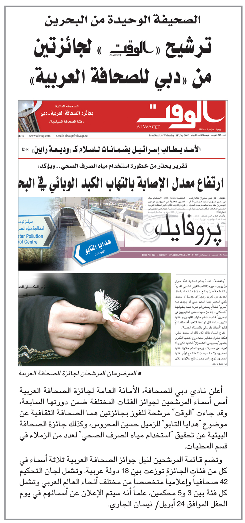 أعلن نادي دبي للصحافة، الأمانة العامة لجائزة الصحافة العربية أمس أسماء المرشحين لجوائز الفئات المختلفة ضمن دورتها السابعة، وقد جاءت ''الوقت'' مرشحة للفوز بجائزتين هما الصحافة الثقافية عن موضوع ''هدايا التابو'' للزميل حسين المحروس، وكذلك جائزة الصحافة البيئية عن تحقيق ''استخدام مياه الصرف الصحي'' لعدد من الزملاء في قسم المحليات.