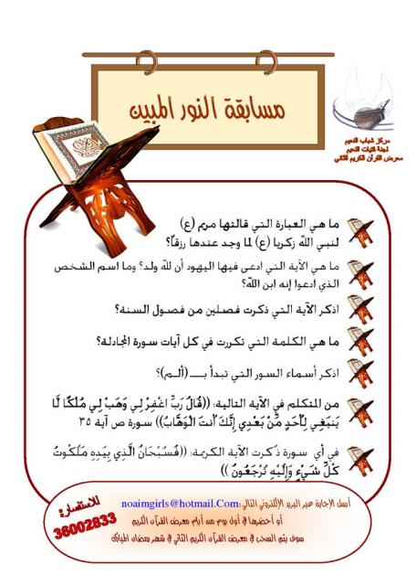 شاركوا معنا في مسابقة النور المبين في معرض القرآن الكريم الثاني