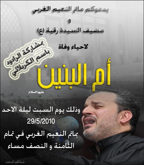 بأسمك وإنتخى بك وتوسل بك عند الله وشكى لك حاجته مناديا يا أم البنين .... يا أم البنين .... يا أم البنين