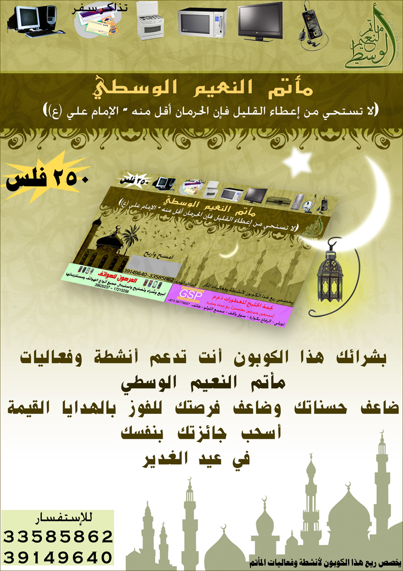 ساهم في دعم أنشطة وفعاليات .~ مأتم الـنـعـيـم الوسطي~. وإدخل السحب بشرائك الكوبون
