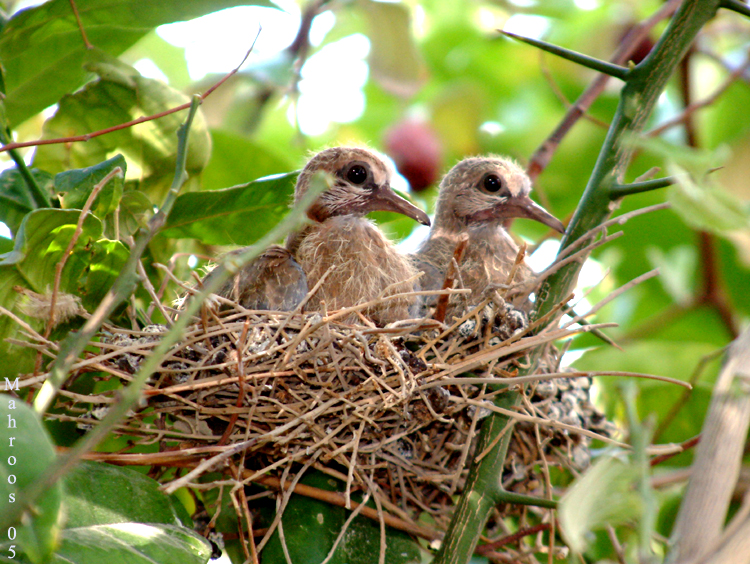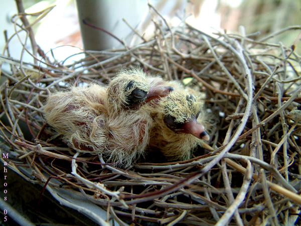 بين شجرتي "أترج" متداخلتين كثيراً وجدت عشاً به فرخان غطى الريش جلدهما. كانا في صحة جيدة، يقظين، ونموهما نموذجي. كأنهما ينتظران أمهما. وعلى الرغم من اقتراب العشّ من الأرض إلا أن الوصول إليهما بالكاميرا فيه شيء من الصعوبة. فأغصان الأترج شديدة التداخل، بها شوك كثير وحاد جداً. ها هما ينظران إليّ مثل غريب. التقطتُ لهما صوراً عديدة فلم يحركا ساكناً. هل نحن في أستوديو قبيح، أمام مصور قبيح، يصور جلد الوجه لا الوجه؟!! موظف لا مصور!! بعد أيام قلائل طارت الفراخ إلى أقرب شجرة، وخلت الأعشاش من الدفء، ولم يبق غير صور تنتظر سيرتها.