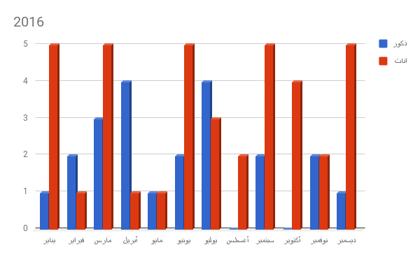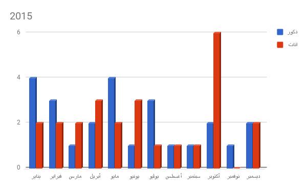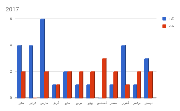 وسجل الإناث نسبة أعلى من الذكور إذ بلغت نسبة الوفيات بينهن 138، في حين أن النسبة بين الذكور كانت 117، وكان عدد الوفيات في 2013 فبلغ 57 وفاة، أما في العام 2014 فبلغ 38 حالة، وفي 2015 فبلغ 50، أما في العام 2016 فسجل 61 حالة وفاة.